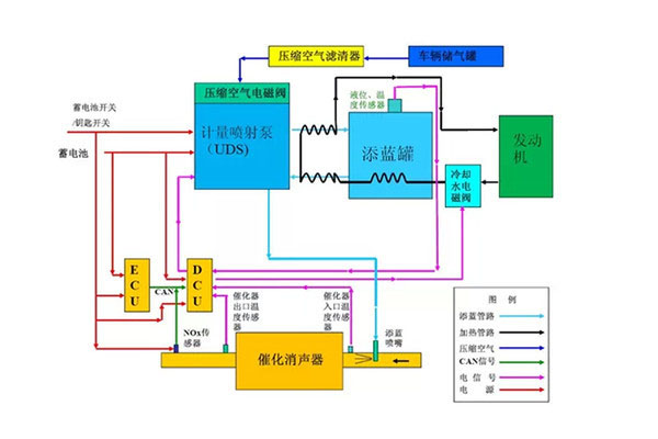 將霧化后的還原劑尿素(NH2CONH2)噴入排氣管。尿素在排氣管混合區(qū)遇高溫分解成氨氣(NH3),與排氣充分混合后進(jìn)入SCR催化消聲器。在催化消聲器里,NH3和NOx反應(yīng)生成氮?dú)猓∟2,無(wú)毒)和水,然后排放到大氣中。