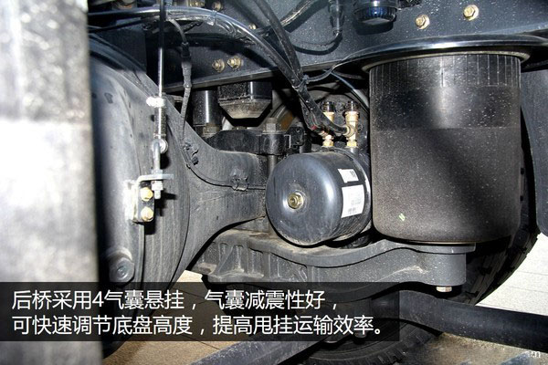 這款車型亮點(diǎn)之一后橋采用4氣囊懸掛,氣囊減震性好,一方面可以減少貨物顛簸,提高駕乘人員舒適性,另一方面通過ECAS系統(tǒng)可以快速調(diào)節(jié)底盤高度,能夠減少風(fēng)阻,提高甩掛運(yùn)輸裝卸效率。