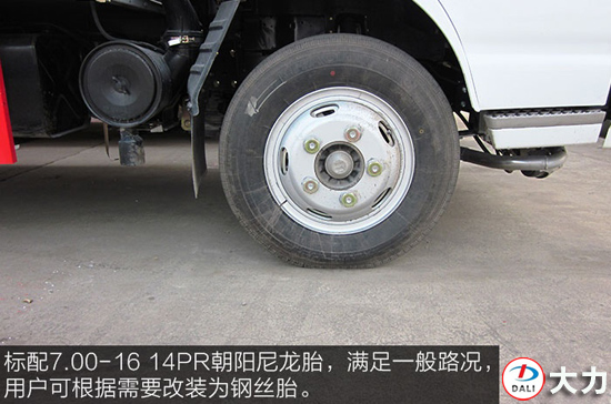 標(biāo)配7.00-16 14PR朝陽(yáng)尼龍?zhí)ィ瑵M足一般路況,用戶可根據(jù)需要改裝為鋼絲胎。