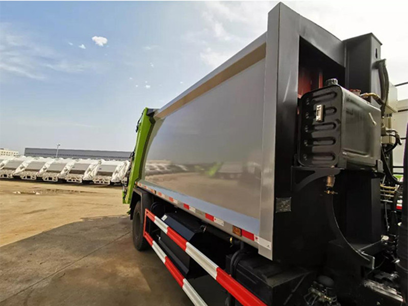 1、產(chǎn)品結(jié)構(gòu)介紹A、箱體結(jié)構(gòu) 垃圾箱采用加強(qiáng)梁和高強(qiáng)度鋼板焊接而成牢固的框架結(jié)構(gòu),側(cè)面采用縱向無拼焊工藝的整板制作,側(cè)板上下加強(qiáng)梁與側(cè)板整體成型,采用專用設(shè)備冷彎成型,大R角成型,提高了剛性,側(cè)板縱向無焊縫,有效避免了傳統(tǒng)拼焊工藝長(zhǎng)時(shí)間使用造成的焊縫疲勞失效等缺陷,頂面為圓弧曲面,箱體底板與箱體側(cè)板采用先進(jìn)的拼焊工藝,避免了傳統(tǒng)焊接工藝長(zhǎng)期使用造成箱體漏水的現(xiàn)象,箱體前下部設(shè)置有大容量污水收集箱,提高了車輛污水儲(chǔ)存能力,整體箱體外形美觀,重量輕,受力好,不易變形。