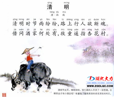 清明,農(nóng)歷二十四節(jié)氣之一。中國傳統(tǒng)的清明節(jié)大約始于周代,距今已有二千五百多年的歷史!稓v書》:“春分后十五日,斗指丁,為清明,時萬物皆潔齊而清明,蓋時當(dāng)氣清景明,萬物皆顯,因此得名。”清明一到,氣溫升高,正是春耕春種的大好時節(jié),故有“清明前后,種瓜種豆”。清明節(jié)是一個祭祀祖先的節(jié)日,主要是掃墓,掃墓是慎終追遠(yuǎn)、敦親睦族及行孝的具體表現(xiàn)。清明節(jié)是在仲春與暮春之交,也就是冬至后的106天。2006年5月20日,該民俗節(jié)日經(jīng)國務(wù)院批準(zhǔn)列入第一批國家級非物質(zhì)文化遺產(chǎn)名錄。另,詠清明詩極多,杜牧《清明》詩最為著名。